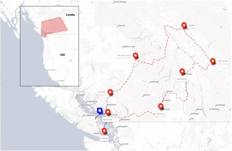 Aujourd’hui, nous prenons la direction du nord en longeant les rives du lac Okanagan et Upper Arrow Lake. Nous ferons deux courtes traversées en ferry, une expérience typique au Canada, avant d’arriver à Revelstoke, une charmante ville nichée au cœur des montagnes.